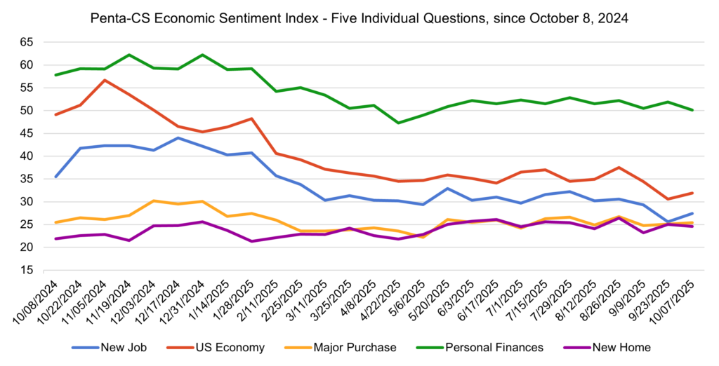 The latest biweekly reading of the Penta-CivicScience Economic Sentiment Index (ESI) rose by 0.2 points, from 31.7 to 31.9, at the start of the third quarter of 2025 and following the first government shutdown since 2019.