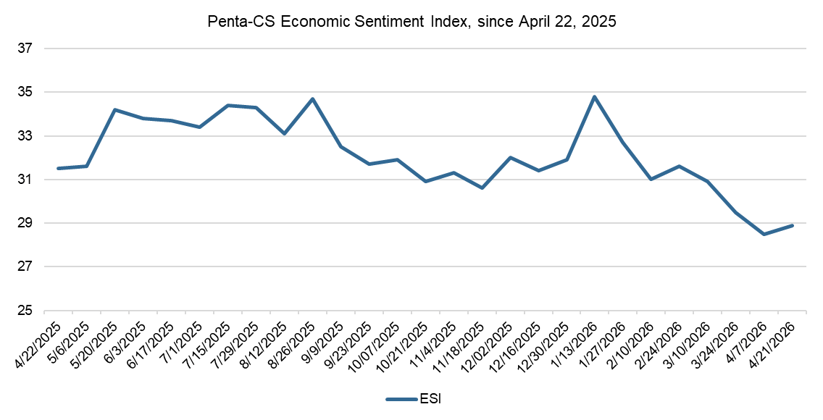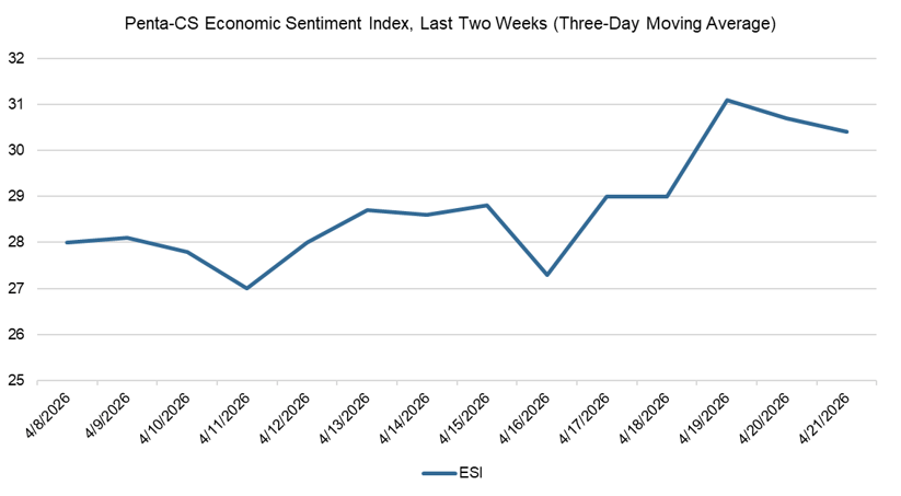 The ESI's three-day moving average began this two-week stretch at 28.0 on April 8. It decreased to a low of 27.0 for the period on April 11 before climbing to 28.8 halfway through the session on April 15. Following another brief dip, the three-day moving average rose to a session high of 31.1 on April 19 before closing out the session at 30.4 on April 21.