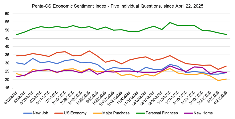 The latest biweekly reading of the Penta-CivicScience Economic Sentiment Index (ESI) increased 0.4 points to 28.9, rising above the 13-year low in sentiment seen last period after a ceasefire to the Middle East conflict was announced.